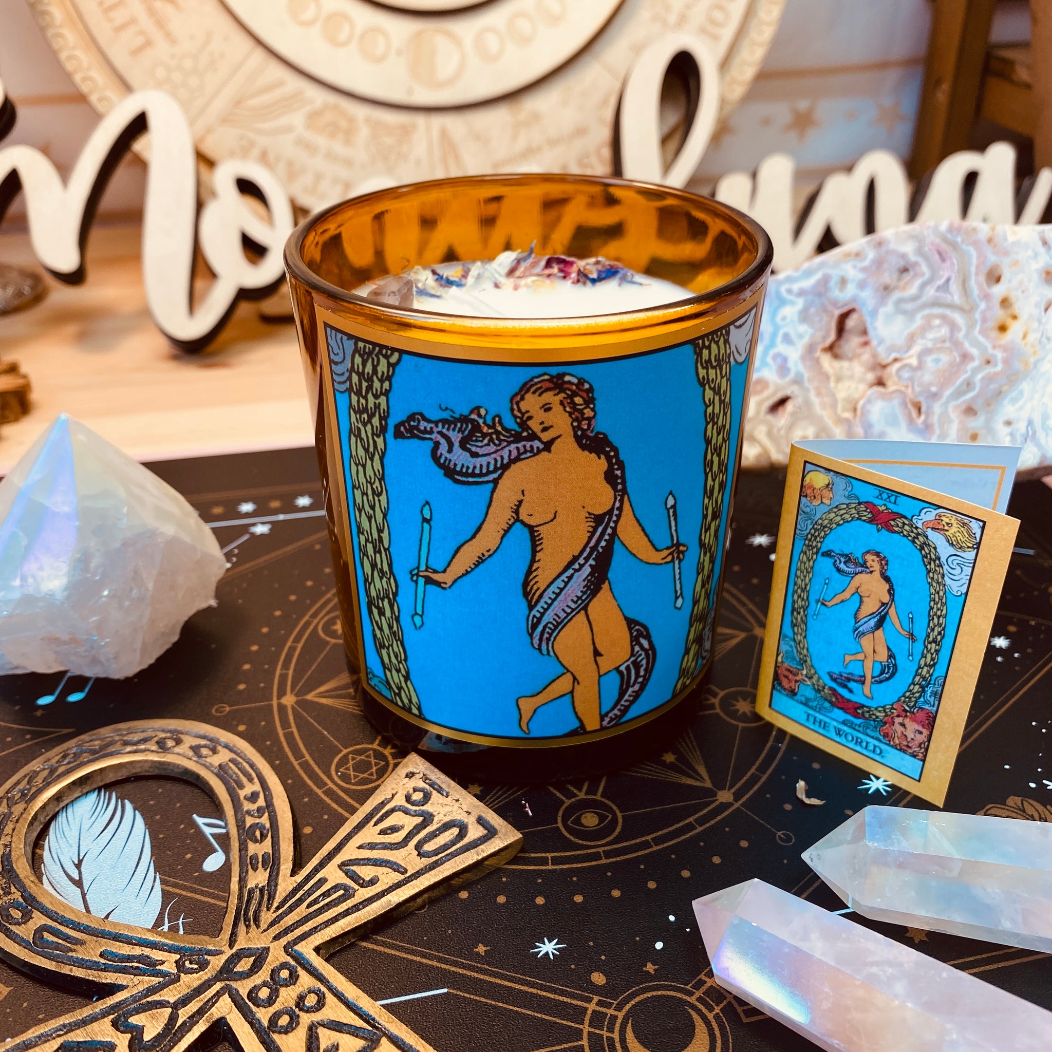 (Cotton wick, GMM-free soy wax, organic coconut oil, proprietary blend of organic essential oils encasing a crystal charged under the full moon.)